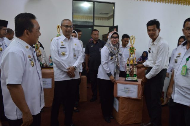 Cyberkatulistiwa.com, Kota Agung — Bupati Tanggamus Hj. Dewi Handajani menyerahkan hadiah bagi pemenang Lomba Pekon/Kelurahan dan Lomba BBGRM Tingkat Kabupaten Tanggamus.