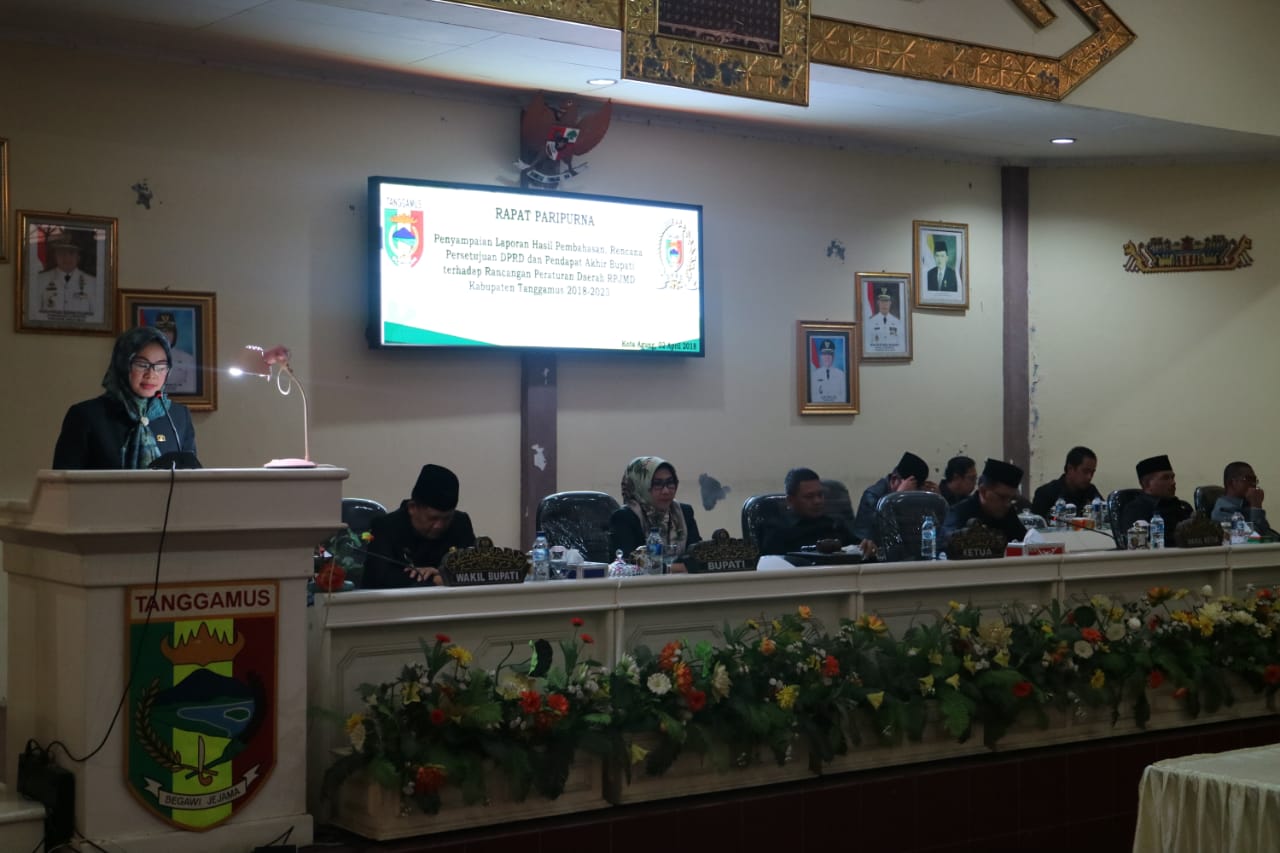 Juru Bicara Badan Pembentukan Peraturan Daerah (Banperda) DPRD Tanggamus Sri Wulandari dalam laporannya mengatakan bahwa Rancangan Peraturan Daerah tentang RPJMD Kabupaten Tanggamus tahun 2018-2023 merupakan Program Pembentukan Peraturan Daerah Kabupaten Tanggamus Tahun 2019 dan telah disepakati bersama antara Kepala Daerah dan DPRD Kabupaten Tanggamus sebagaimana tertuang dalam Berita Acara Nomor : 8.22/16/08/2018 dan Nomor : 33/PIMP/I/20l8 tanggal 07 November 2018.
