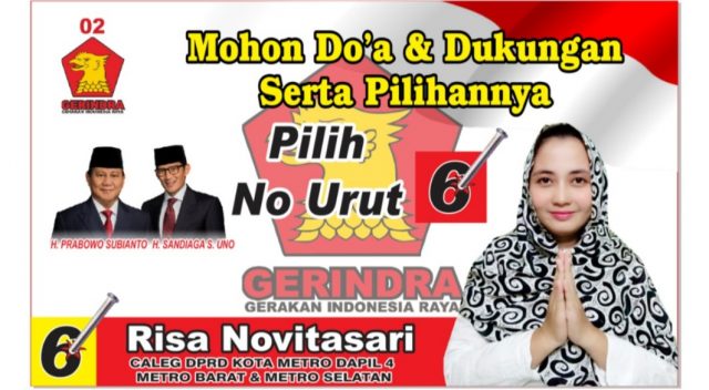 Cyberkatulistiwa.com, METRO — Bertarung di daerah pemilihan (dapil) IV Metro Barat dan Metro Selatan, Srikandi partai Gerindra ( Gerakan Indonesia Raya) Risa Novitasari (30), nomor Urut 6 (enam) optimis dapat merebut satu kursi di DPRD Kota Metro.