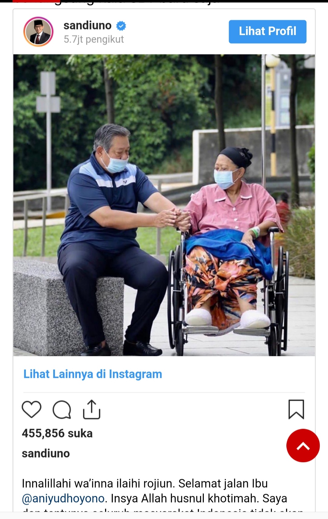 “Innalillahi wa’inna illahi rojiun. Selamat jalan Ibu @aniyudhoyono. Insya Allah husnul khotimah. Saya dan tentunya seluruh masyarakat Indonesia tidak akan bisa lupa jasa-jasa yang Ibu pernah berikan kepada Bangsa ini,” kata Sandiaga lewat akun Instagram resminya.(CNN Indonesia/rls).