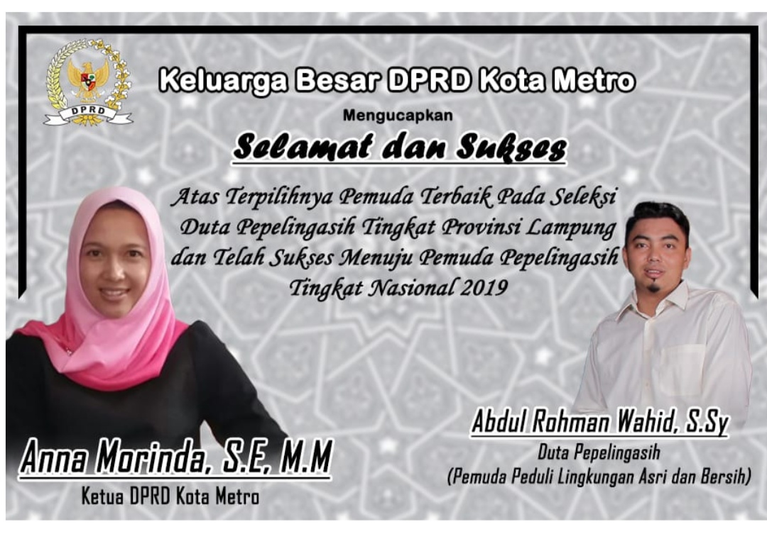Cyberkatulistiwa.com, Metro – Ketua DPRD Kota Metro, Anna Morinda, S.E M.M memberi ucapan selamat kepada Abdul Rohman Wahid, S.Sy atas terpilihnya sebagai Duta Pemuda Peduli Lingkungan Asri dan Bersih (Pepelingasih) tingkat Provinsi Lampung, dan akan menuju pada tingkat nasional pada tahun 2019 ini, (24/06/2019).