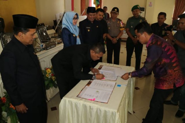 Penandatanganan tersebut dihadiri 34 Anggota DPRD, Wakil Bupati Hi. AM. Syafi’i, Forkopimda, Sekdakab, para Asisten, Staf Ahli, Kepala OPD dan Camat se-Kabupaten Tanggamus.