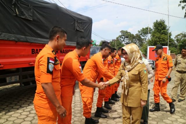 Tanggamus, Cyberkatulistiwa.com – Bertempat di Halaman Badan Penanggulangan Bencana Daerah, Bupati Tanggamus Dewi Handajani didampingi Sekretaris Daerah Hamid Heriansyah Lubis, melepas 12 Personil Tim Gabungan BPBD dan Badan SAR Nasional dalam rangka pencarian warga yang hilang di Perairan Pantai Gigi Hiu Kecamatan Kelumbayan, Selasa 23 Juli 2019.