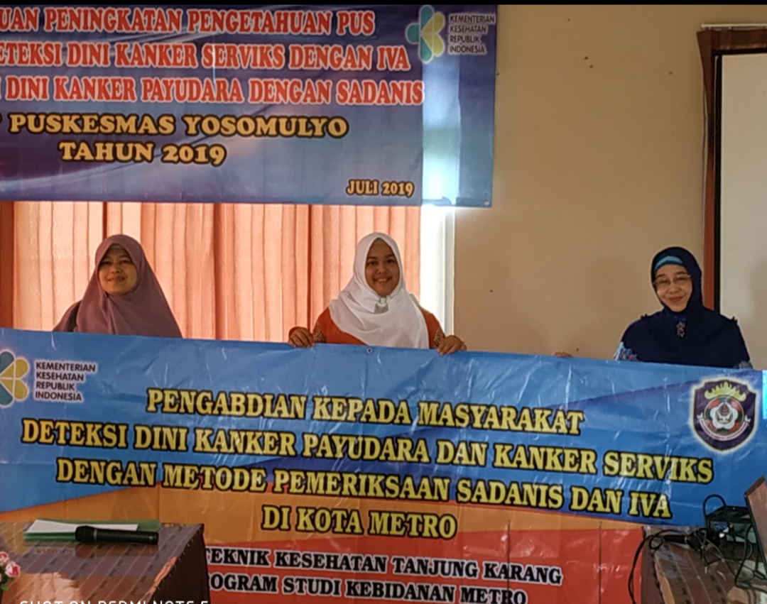 Kegiatan Pengabdian pada masyarakat Poltekes Prodi Kebidanan Metro ini dengan melakukan pemeriksaan Deteksi Dini Kanker Payudara dan Kanker Serviks dengan Metode Pemeriksaan Sadanis dan IVA di Kota Metro, yang dilaksanakan dari Bulan Juli sampai Bulan November 2019 di seluruh Puskesmas Kota Metro, dengan Ketua Tim Pelaksana Yetti Anggraini, M.Kes, M.Keb dan anggota Yuliawati, M.Kes serta Martini, SKM, MKM.