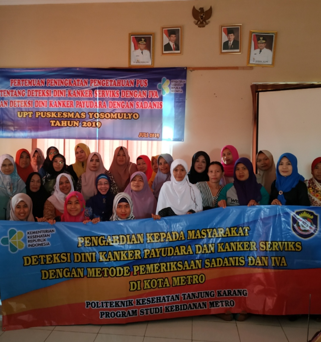 Prodi Kebidanan Metro dengan Kegiatan Pengabdian Pada Masyarakat juga melakukan sosialisasi kepada khususnya wanita agar selalu menjaga kesehatan dan mencegah secara dini penyakit Kanker Serviks melalui pemeriksaan IVA dan Sadanis di Aula Puskesmas Yosomulyo dan dilanjutkan dengan pemeriksaan.
