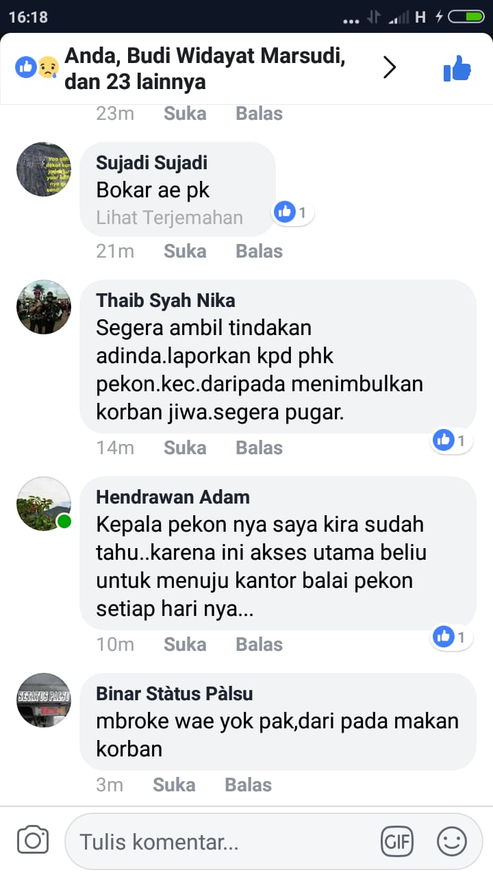 “Segera ambil tindakan adinda. Laporkan kepada pihak Pekon, Kecamatan. Dari pada menimbulkan korban jiwa, segera pugar,”tulis Thaib Syah Nika, warganet Facebook mengunggah dikolom komentar.