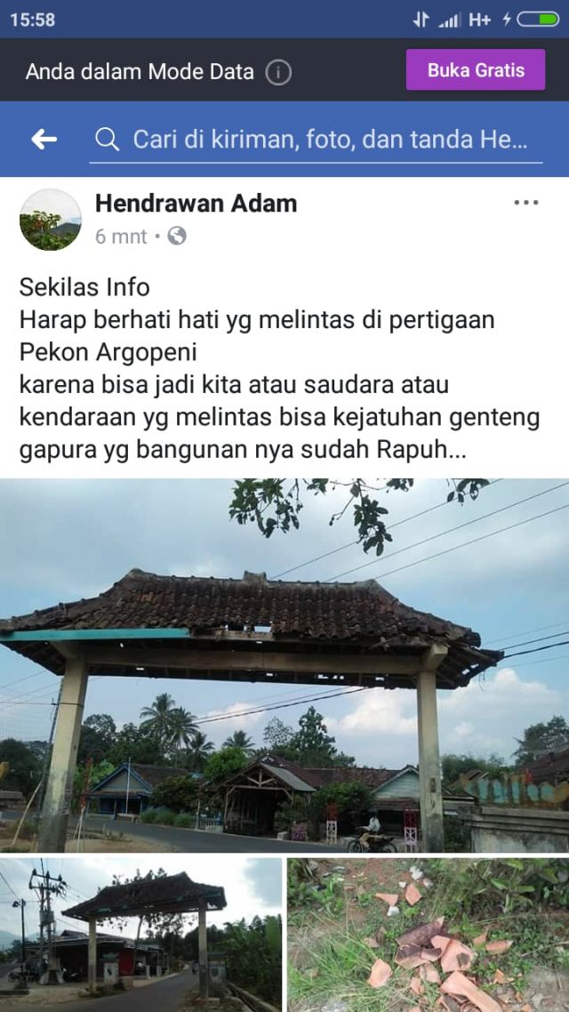 Berikut cuitan status yang di unggah “Sekilas Info Harap berhati hati yang melintas di pertigaan Pekon Argopeni, karena bisa jadi kita atau saudara, atau kendaraan yang melintas bisa kejatuhan genteng gapura yg bangunannya sudah Rapuh,”