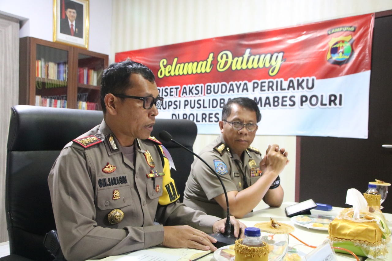 Kunjungan Tim Puslitbang Polri ini bertujuan melakukan penelitian dalam bentuk riset aksi tentang budaya anti korupsi anggota Polri.