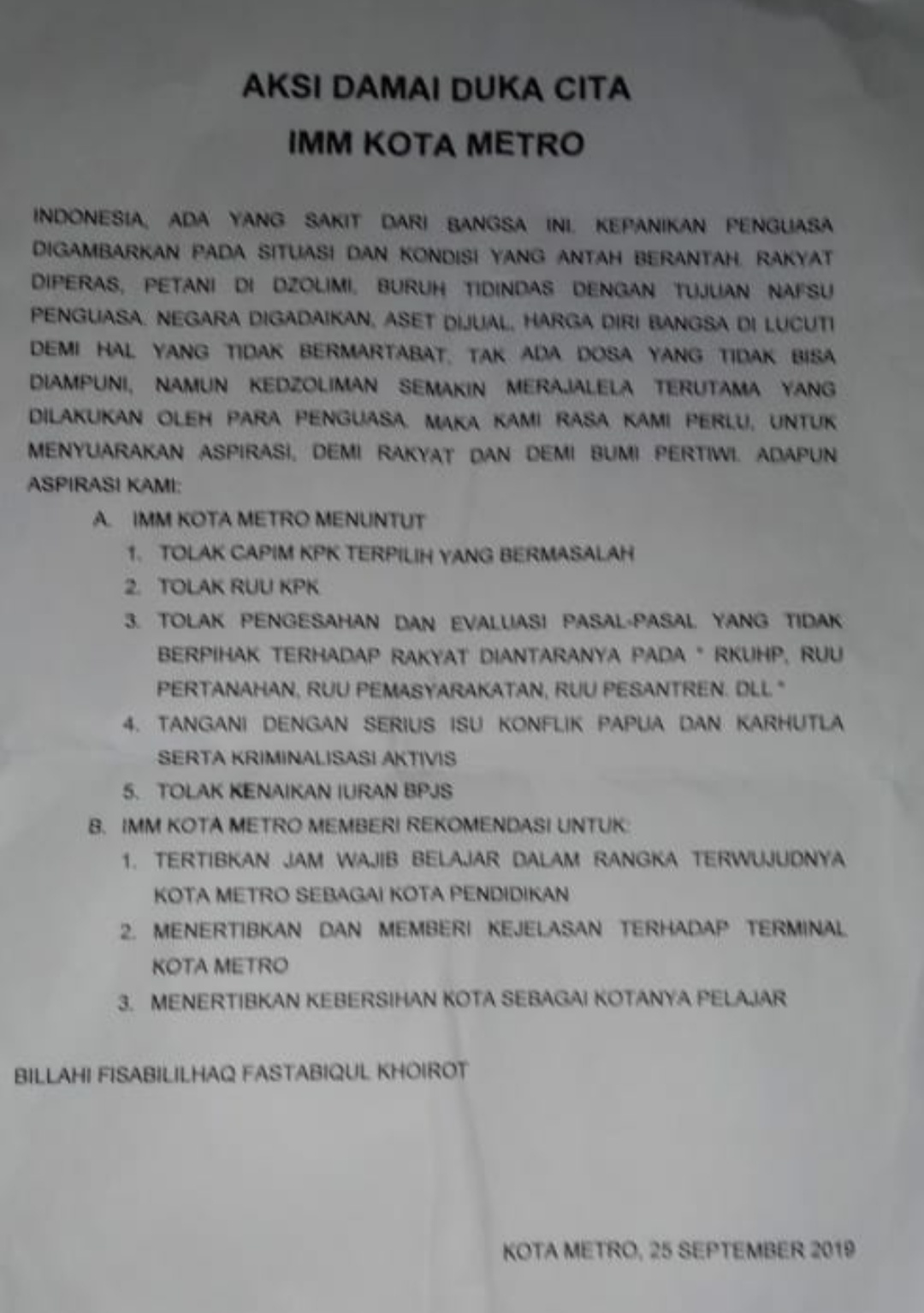 “Saya sampaikan, aksi damai ini sebagai bentuk dukacita kota metro,” ujar korlap mahasiswa.