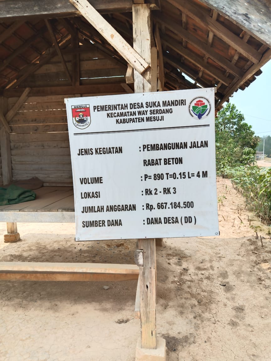 MESUJI, Cyberkatulistiwa.com – Pembangunan Jalan Rabat Beton yang bersumber dari Dana Desa (DD) Tahun Anggaran 2019 dengan Pagu senilai Rp. 667.184.500, di Desa Suka Mandiri , Kecamatan Way Serdang, Kabupaten Mesuji. Diduga syarat penyimpangan.