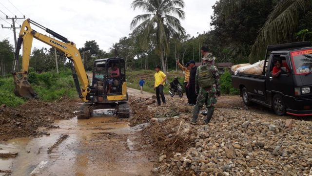 Dua alat berat tampak bekerja membersihkan material berupa batu dan tanah yang berada di penggal jalan Pekon Pardawaras dan Pekon Way Kerap, sehingga kendaraan kecil maupun sepeda motor sudah dapat melalui jalan tersebut.
