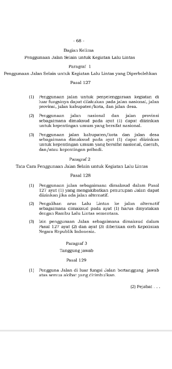 Pada Pasal 127 ayat 2 disebutkan penggunaan jalan nasional dan provinsi dapat diizinkan untuk kepentingan umum bersifat nasional.