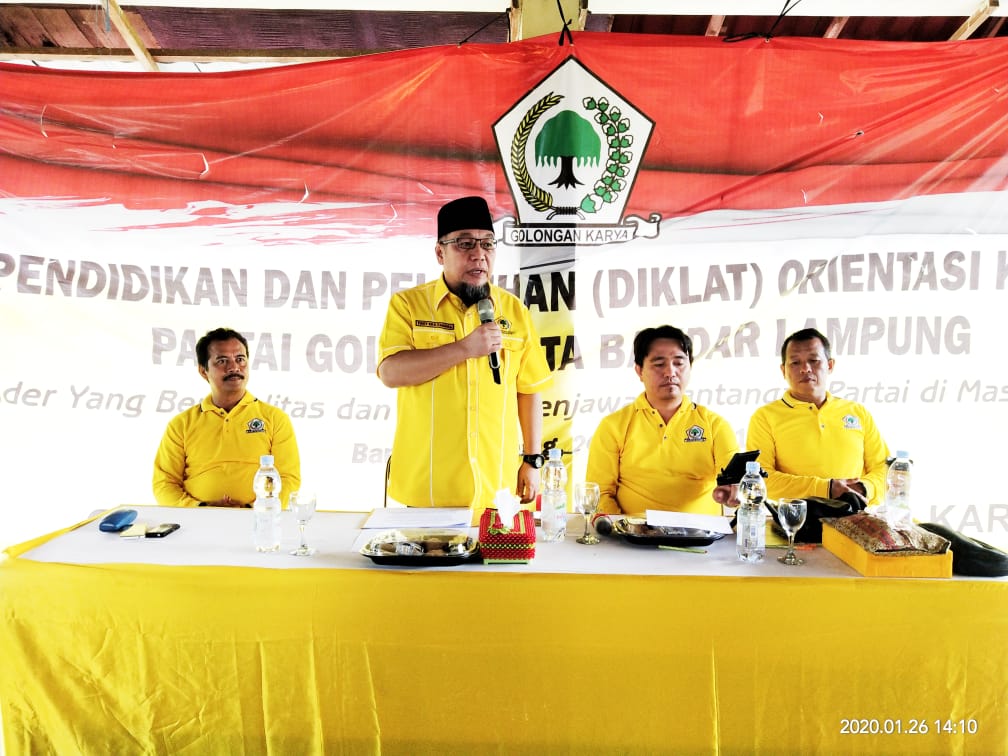 Politisi Senior Partai Golkar Lampung ini mengapresiasi kegiatan Diklat yang dilaksanakan oleh DPD Partai Golkar Kota Bandar Lampung dan berpesan, kegiatan Diklat Kaderisasi ini harus diteruskan hingga tingkat Kecamatan dan Kelurahan, dalam rangka memantapkan Konsolidasi Kelembagaan di Partai Golkar dan melahirkan Kader-Kader milenial sebagai generasi penerus Partai Golkar.