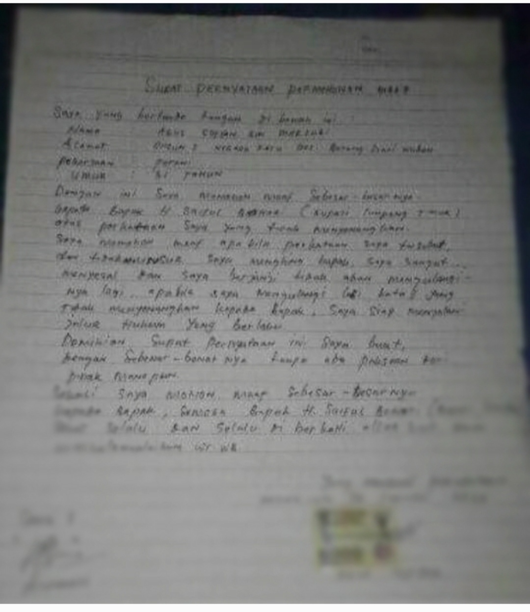 Diketahui pada postingan di medsosnya tersebut, akun yang bernama berinisial YA juga mengunduh suatu foto berupa surat pernyataan untuk permintaan maaf, dengan disertai materai 6000, lalu ditandatangani atas nama Agus.S dan saksi atas nama Ridwan. (red/bb).
