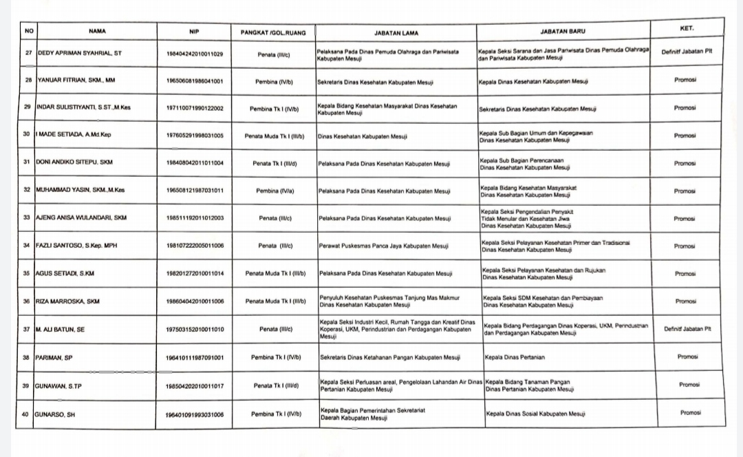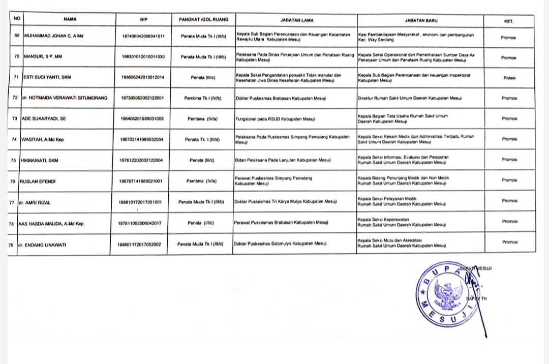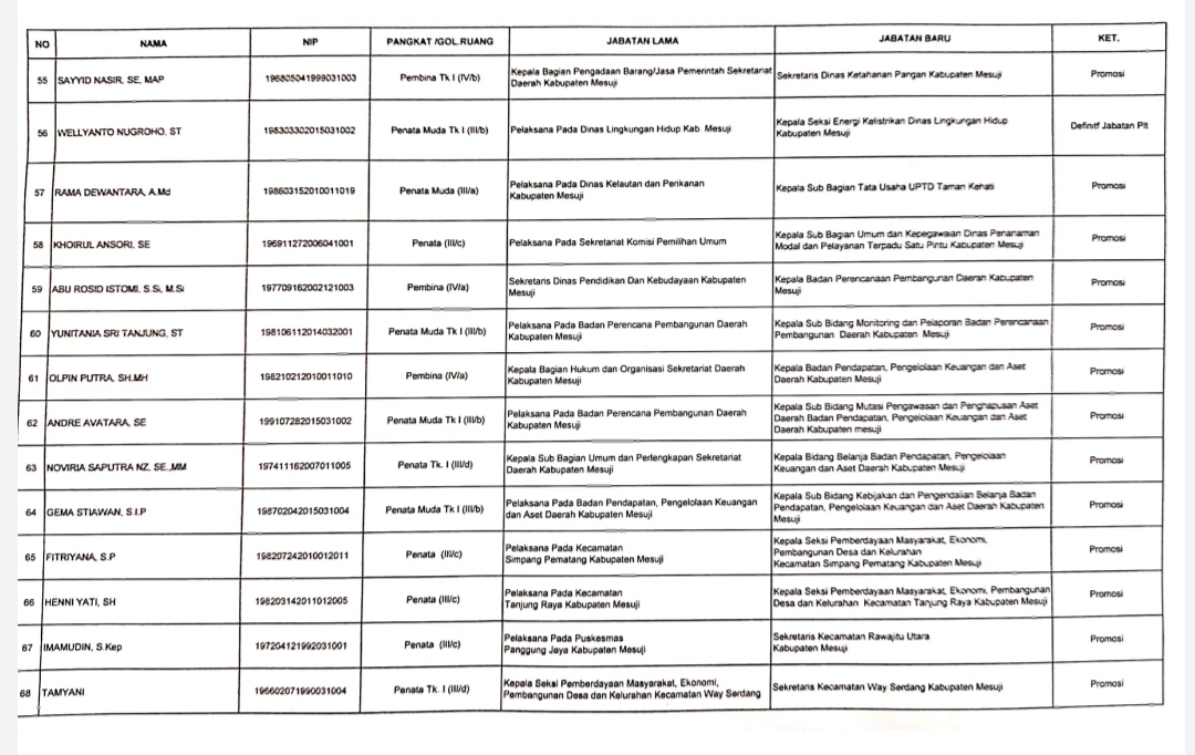 Berikut nama-nama peserta pengangkatan, pemindahan dan pemberhentian Aparatur Sipil Negara di lingkungan Pemerintah Kabupaten Mesuji berdasarkan surat keputusan Bupati Mesuji :