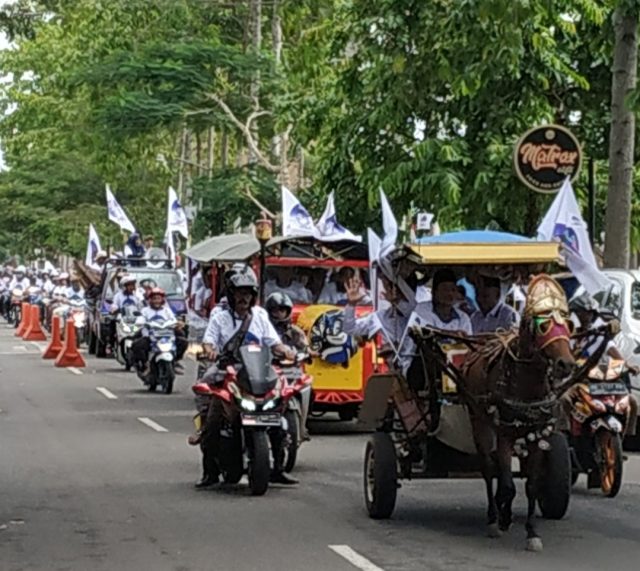 Bakal calon independen tersebut datang ke KPU dengan mengendarai andong dan dikawal sekitar 400 orang sahabat Wahdi – Qomaru (Wa-Ru).
