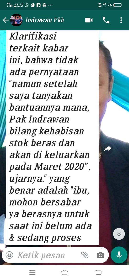Indrawan menyatakan bahwa pernyataan Nurlela dalam pemberitaan tersebut tidak benar dan mengada ada, yang sesungguhnya adalah dirinya menyampaikan “ibu mohon bersabar ya berasnya untuk saat ini belum ada dan dalam proses mendatangkannya,” tak lama dari dikeluarkannya struk tersebut, Alhamdulillah bantuan berasnya pun sudah diterima dengan baik oleh ibu Nurlela, jelasnya.