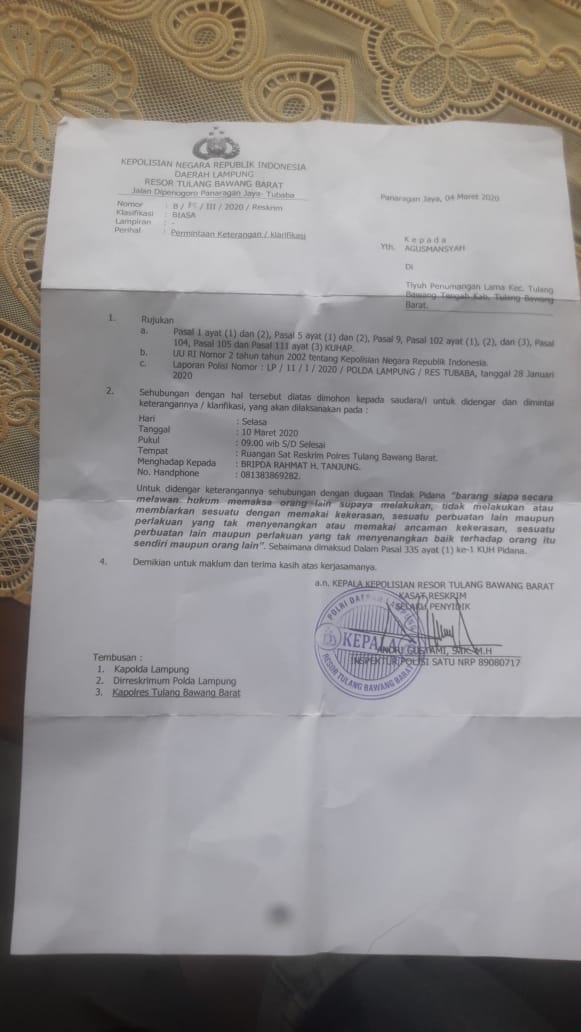 Tubaba, Cyberkatulistiwa.com – Surat panggilan dari Polres Tulang Bawang Barat (Tubaba) untuk Agusmansyah warga Tiyuh Penumangan Kecamatan Tulang Bawang Tengah Kabupaten Tulang Bawang Barat – Lampung, Rabu (04/03/2020).