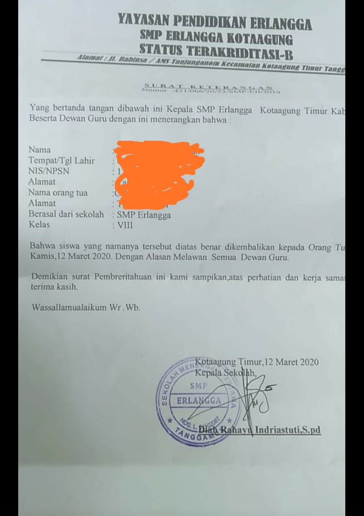 Berdasarkan surat keterangan yang dikeluarkan pihak sekolah SMP Erlanggga Kotaagung, tertanggal 12 Maret 2020.