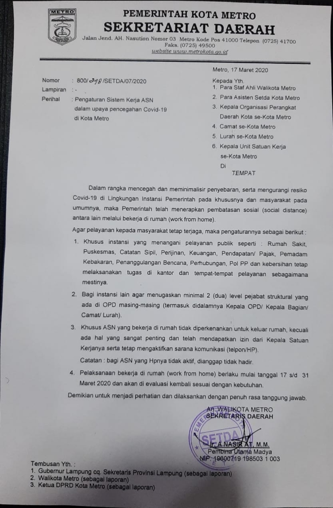 Surat yang ditandatangani langsung oleh Sekertaris Daerah Kota Metro Ir. A. Nasir AT, M.M tersebut ditujukan ke seluruh perangkat pemerintahan mulai dari Staf Ahli Walikota, para Asisten Setda Kota Metro, kepala OPD, Camat, Lurah, dan kepala Unit Satuan Kerja se-Kota Metro.
