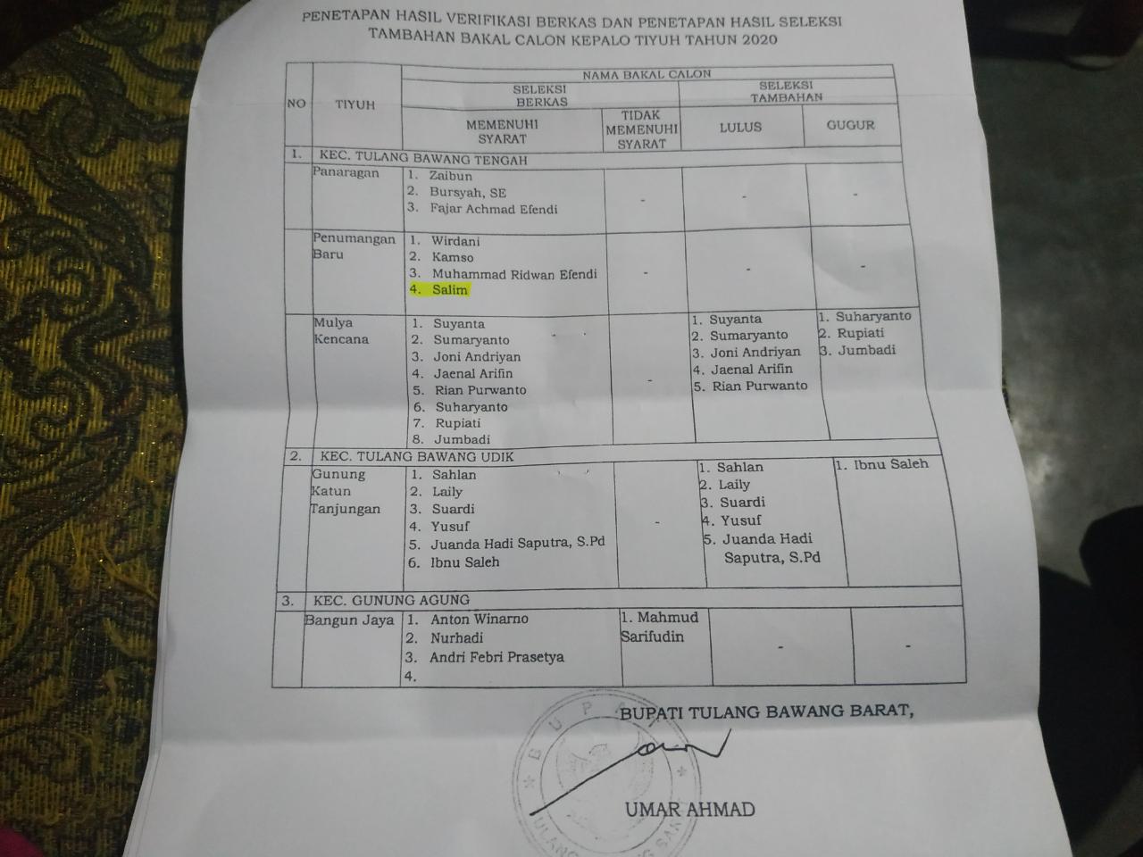 Inilah hasil penetapan Pilkati 2020 yang di bumbui tanda tangan Bupati Tubaba Umar Ahmad, Jumat (20/03/2020).