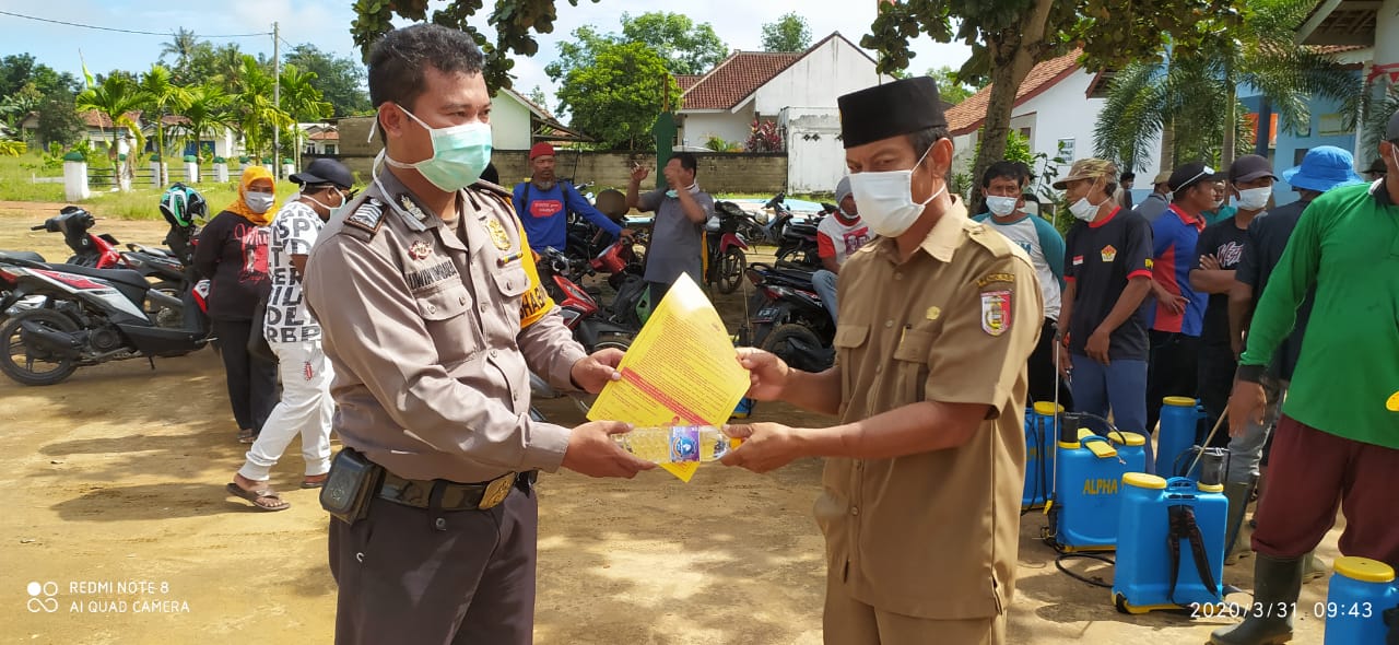 Nampak antusias perangkat Kampung dan masyarakat menggendong tangki semprot, sedang melakukan penyemprotan disinfektan lingkungan rumah warga.