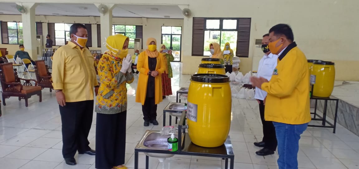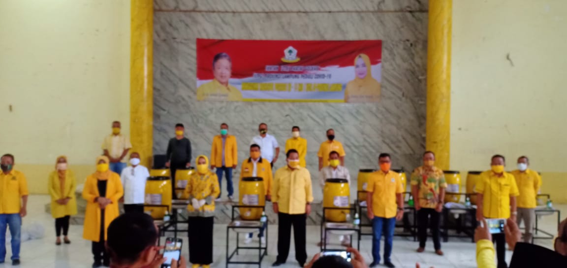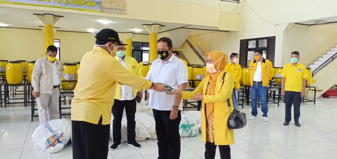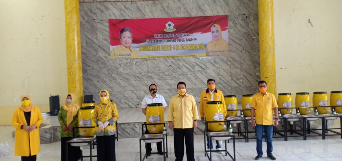 Bandarlampung, Cyberkatulistiwa.com – Peduli pencegahan Covid-19, Ikatan Istri Partai Golkar (IIPG) Provinsi Lampung, memberi bantuan 100 Wastafel Portable kepada DPD Partai Golkar Kabupaten/Kota se-Provinsi Lampung. Selain itu, DPD Partai Golkar Lampung juga membagi 15 ribu masker dan brosur himbauan Covid-19 serta bantuan paket sembako.