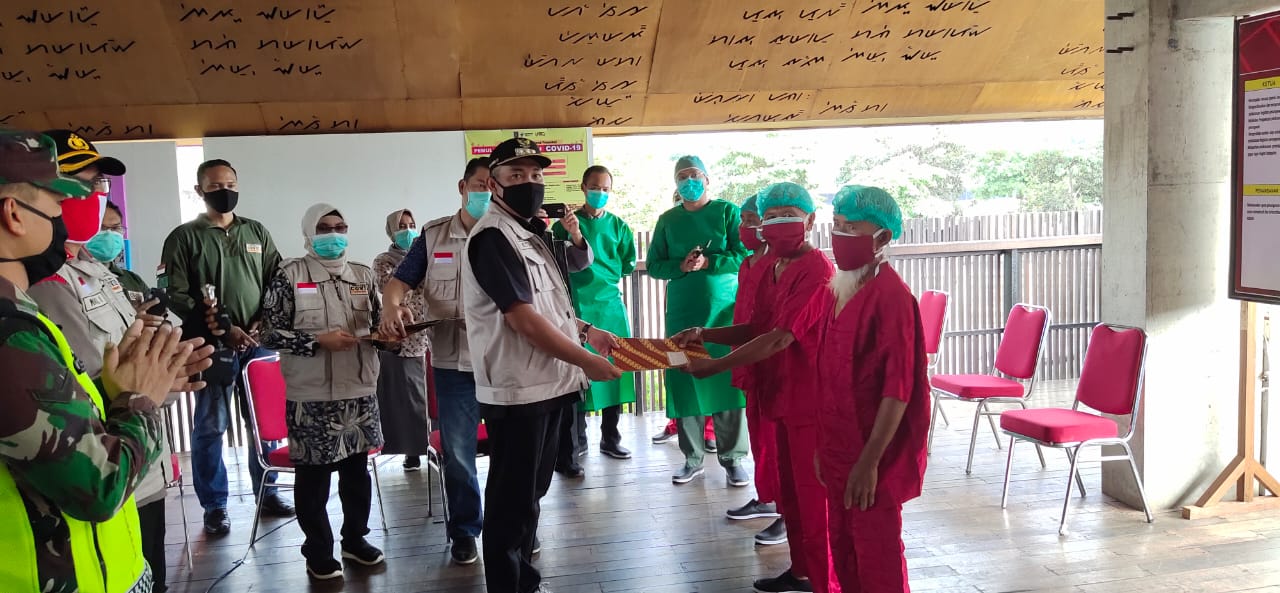 Bupati Umar Ahmad secara simbolis memberikan ucapan selamat atas kesembuhan dan meminta para pasien yng telah sembuh untuk selalu menjaga kesehatan. (Iwan/Kominfo).