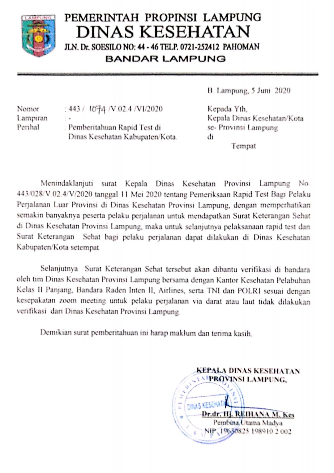 Surat Kepala Dinas Kesehatan Provinsi Lampung dengan No.443/028/ V. 02.4/V/2020 Tanggal 11 Mei 2020 Tentang pemeriksaan Rapid Test bagi pelaku perjalanan luar Provinsi di laksanakan di Dinas Kesehatan Provinsi Lampung.