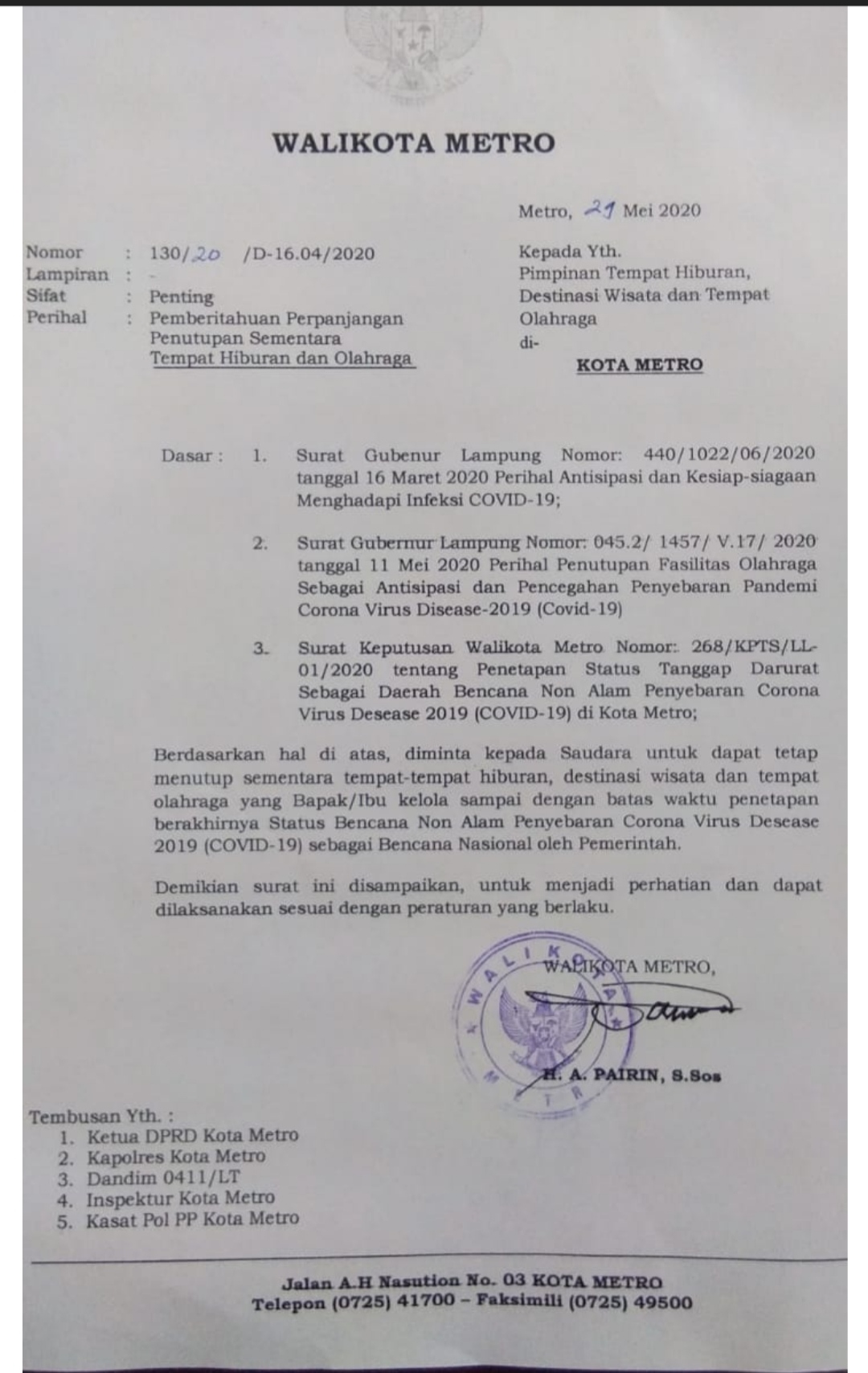 Berdasarkan Surat Walikota Metro dengan Nomor. 130/20/D – 16.04/2020 yang bersifat Penting, Tentang perpanjangan penutupan sementara tempat Hiburan dan olahraga.