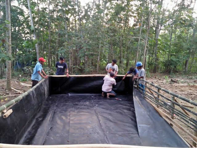 “Ya ini kami pengurus kelompok budidaya ikan (Pokdakan) desa Wira Bangun, dengan tekad semangat dan kompak kita sedang mengerjakan pembuatan kolam ikan, kami mendapat bantuan berupa terpal, untuk pembuatan kolam dan benih bibit ikan lele dan pakan”, jelas Mujiono pengawas kelompok Pokdakan Desa Wira Bangun.