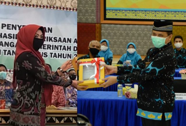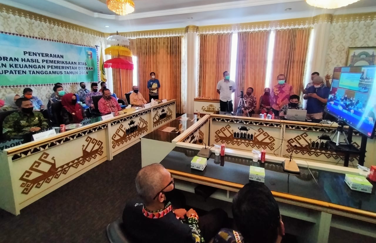 Penyerahan LHP dilakukan oleh Kepala BPK RI Perwakilan Lampung Hari Wiwoho, SE., MM., Ak., CSFA, CA., dari Kantor BPK RI Perwakilan Lampung, yang diterima oleh Bupati Hj. Dewi Handajani dan Ketua DPRD Heri Agus Setiawan, secara virtual melalui Video Conference di Ruang Rapat Bupati Tanggamus, Jum’at (26/6/20).