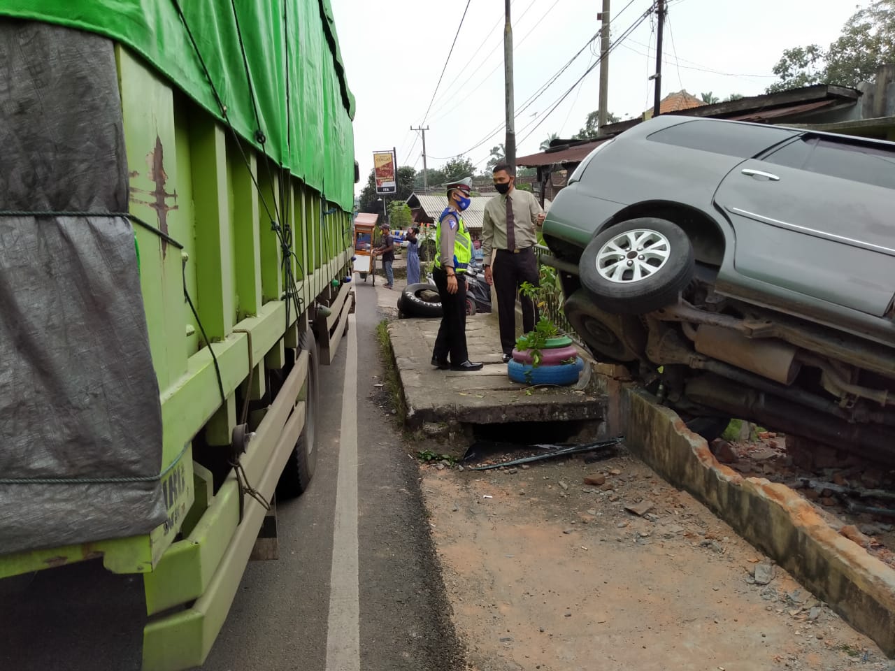 Kecelakaan diduga akibat blong rem truck fuso bermuatan karnel biji sawit diperkirakan 25 ton dari arah Kota Agung menuju Talang Padang dengan posisi jalanan turunan.