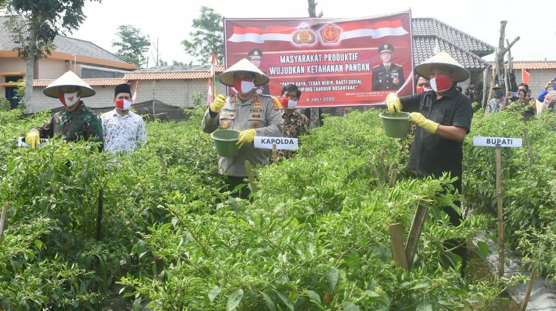 Tubaba, Cyberkatulistiwa.com – Kapolda Lampung Inspektur Jendral (Irjen) Pol Drs. Purwadi Arianto, M.Si dan Danrem 043/Gatam Kolonel Inf Toto Jumariono berkunjung ke Kampung Tangguh Nusantara (KTN) Tiyuh Pulung Kencana, Kecamatan Tulang Bawang Tengah, Kamis (09/07/2020). Bupati Tubaba UmarAhmad mendampingi kedua tamunya itu saat melakukan panen raya cabe dan jamur, serta ikan lele di kebun dan kolam milik warga.