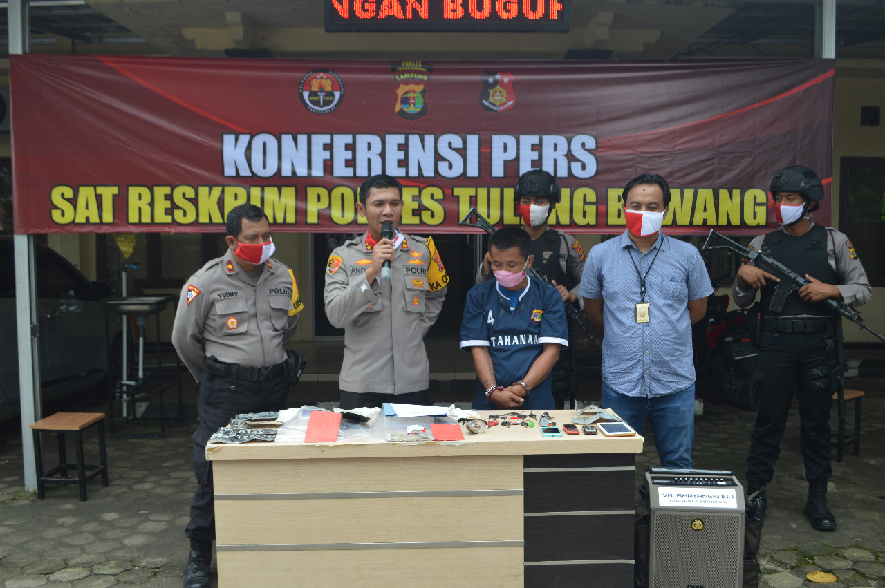 “Pelaku yang berhasil ditangkap oleh personel kami ini berinisial HO als ST (38), warga Kampung Bujuk Agung, Kecamatan Banjar Margo, Kabupaten Tulang Bawang,” ujar Kapolres Tulang Bawang AKBP Andy Siswantoro, SIK yang didampingi Kabag Ops Kompol Yudi Pristiwanto, SH dan Kasat Reskrim AKP Sandy Galih Putra, SH, SIK saat menggelar konferensi pers, hari Kamis (16/07/2020) siang, di Mapolres setempat.