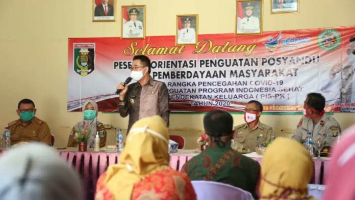 LAMTIM, Cyberkatulistiwa.com – Bupati Lampung Timur Hi. Zaiful Bokhari, memberi sambutan dalam acara Orientasi Penguatan Posyandu dengan Pemberdayaan Masyarakat dalam rangka Pencegahan Covid-19 melalui Penguatan Program Indonesia Sehat Dengan Pendekatan Keluarga (PIS-PK) Kabupaten Lampung Timur Tahun 2020, Selasa (18/08/2020).