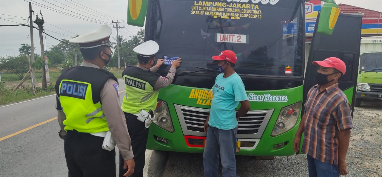 Lanjutnya, stiker imbuan yang dipasangkan oleh petugasnya pada kendaraan umum yang melintas bertuliskan “Ayo Pakai Masker”.