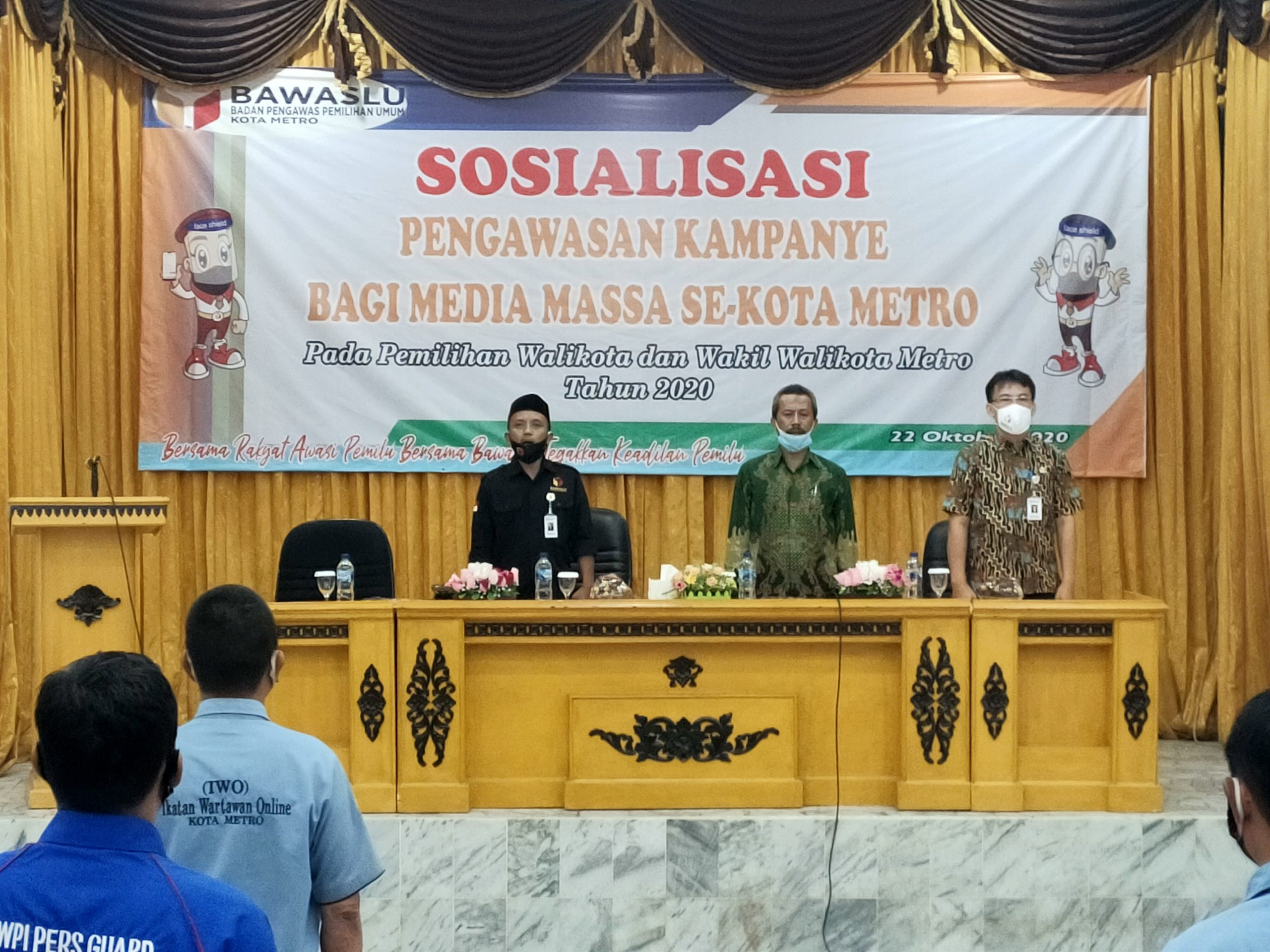 Kegiatan acara Sosialisasi Pengawasan Kampanye Bagi Media Massa Se-Kota Metro juga dihadiri oleh Bawaslu Kota Metro, Tokoh Agama, Akademisi, Nara sumber dan puluhan jurnalis khususnya yang berada di Kota Metro. Kegiatan sosialisasi juga diadakan oleh Bawaslu Kota Metro di Aula LEC Kartika Kota Metro, Kamis (22/10/2020).