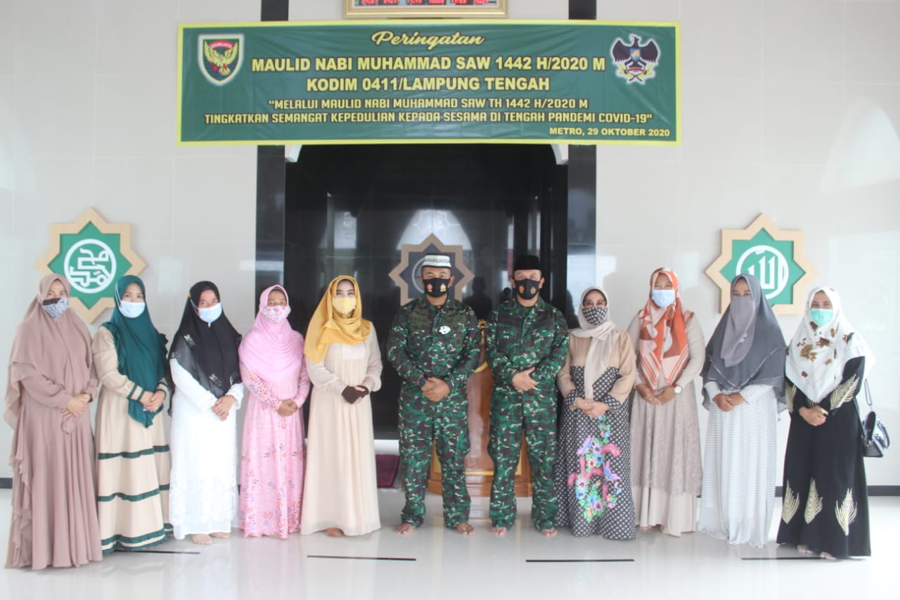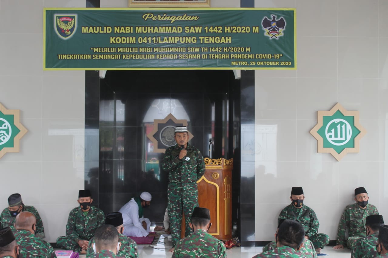 METRO, Cyberkatulistiwa.com – Kodim 0411/LT menggelar peringatan Maulid Nabi Muhammad SAW 1442 H/2020 M di Masjid Al It-Tihad Makodim 0411/LT 22 Hadimulyo Barat Kota Metro, Kamis (29/10/2020).