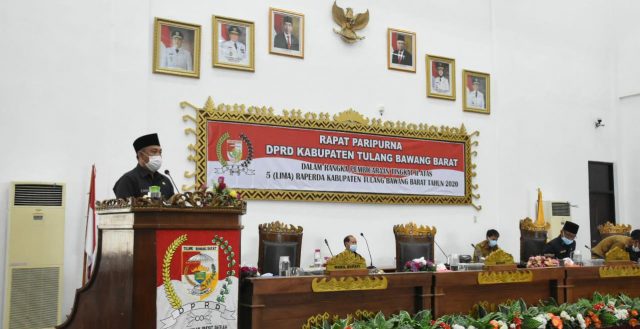 TuBaBa, Cyberkatulistiwa.com – Bupati Tulang Bawang Barat Umar Ahmad, SP menghadiri Rapat Paripurna DPRD dalam rangka pembicaraan tingkat II atas 5 (lima) Raperda yang berlangsung di Ruang Rapat Paripurna Gedung DPRD setempat, Senin (07/12/2020).