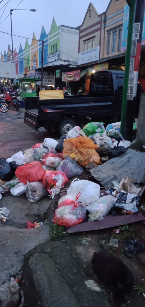 Tumpukan sampah dilingkungan pasar terlihat menggunung terutama di depan Apotik Bintang persis dipinggir Jalan Lintas Barat Kotaagung.