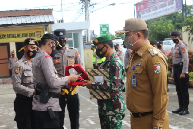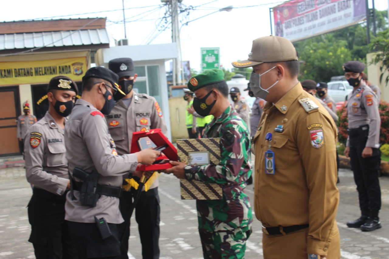 TuBaBa, Cyberkatulistiwa.com – Kapolres Tulang Bawang Barat AKBP Hadi Saepul Rahman S.IK memberikan penghargaan kepada Camat TBT Achmad Nazaruddin, S.IP ., M.IP dan Danramil 412-01/TBT Kapten INF Jauhari Dalam rangka keaktifan penerapan protokol kesehatan dan menciptakan kamtibmas yang kondusif Beserta Anggota Polres Tulang Bawang Barat (TuBaBa), yang melaksanakan Pemulasaran Jenazah Covid 19 Pada saat Apel Pagi di Mako Polres Tulang Bawang Barat, Senin 8 Februari 2021.