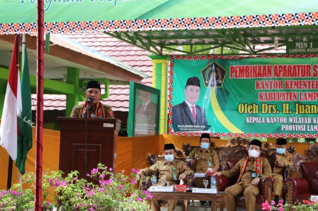 LamBar, Cyberkatulistiwa.com – Pembinaan Aparatur Sipil Negara (ASN) Kantor Kementerian Agama Kabupaten Lampung Barat oleh Drs. Hi. Juanda Naim MH., selaku Kepala Kantor Wilayah Kementerian Provinsi Lampung di Madrasah Ibtidaiyah Negeri (MIN) 1 Negeri Lampung Barat, Pekon Tanjung Raya, Kecamatan Sukau, Senin (29/03/2021).