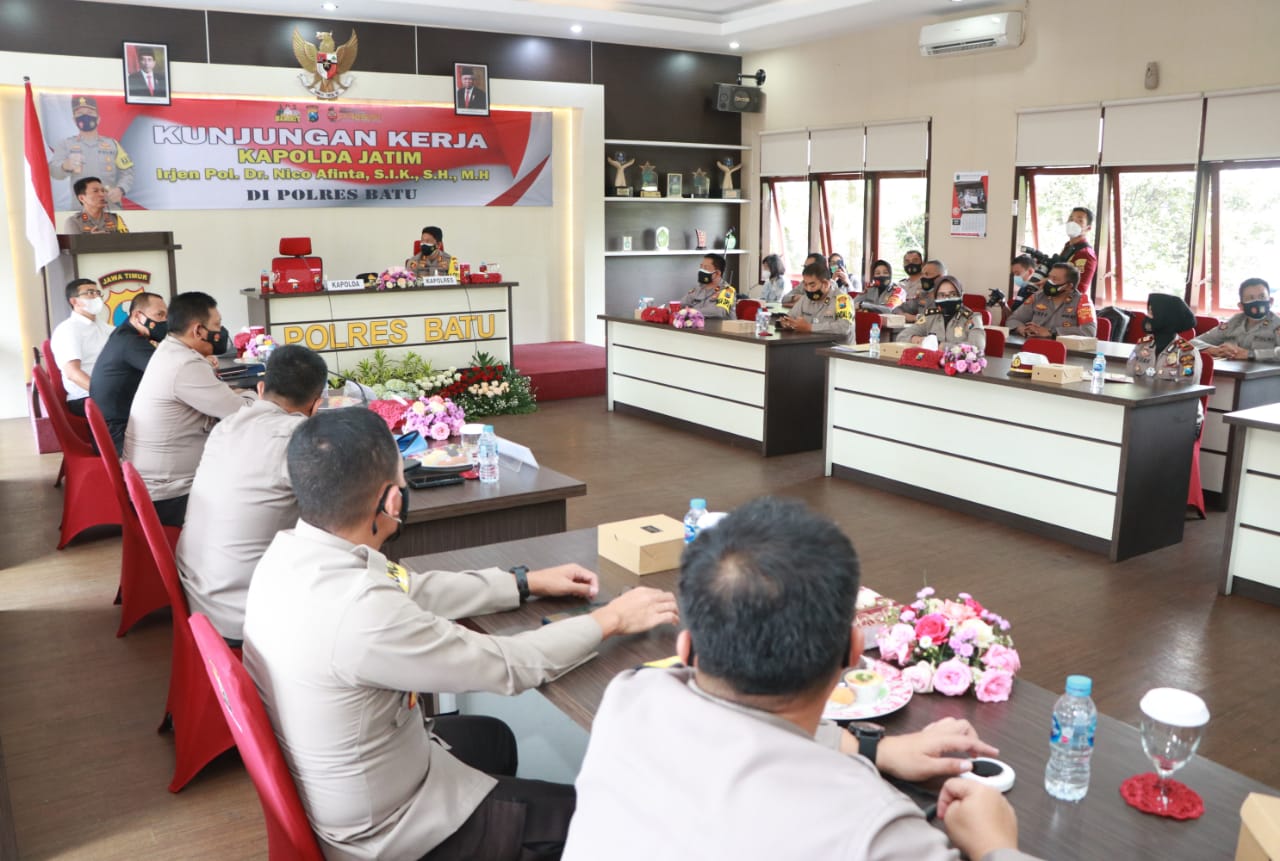 BATU, Cyberkatulistiwa.com – Kapolda Jawa Timur Irjen Pol Nico Afinta, bersama Pejabat Utama Polda Jatim memberikan pemaparan kepada seluruh Pejabat Utama Polres, dan para Kapolsek jajaran Polres Batu pada Kamis (8/4/2021) di gedung Rupatama Mapolres Batu.