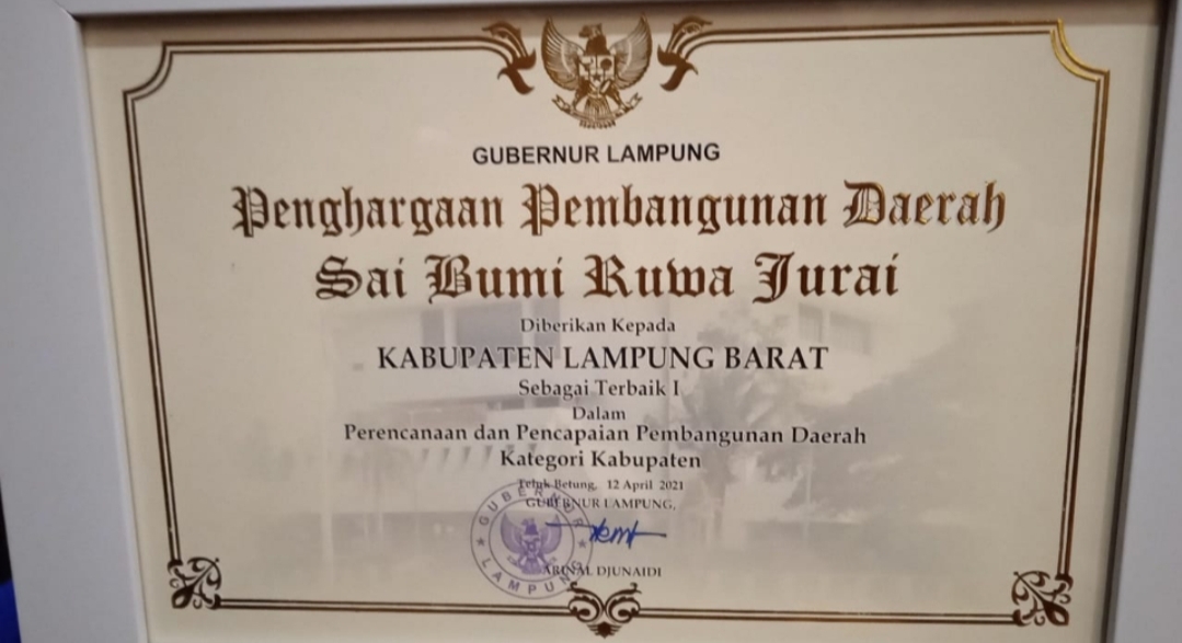 LamBar, Cyberkatulistiwa.com – Pemerintah Kabupaten Lampung Barat (Pemkab Lambar) mendapat penghargaan pembangunan daerah sai bumi ruwa jurai sebagai terbaik I dalam perencanaan dan pencapaian pembangunan daerah kategori kabupaten dari Gubernur Lampung, Ir. Hi. Arinal Djunaidi.
