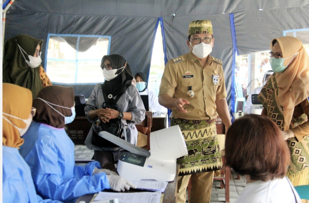 METRO, Cyberkatulistiwa.com – Walikota Metro Wahdi Siradjuddin, meninjau pelaksanaan vaksin massal, di Halaman Masjid Taqwa Kota Metro dan di Balai Kelurahan Mulyojati Kota Metro, Selasa (08/06/2021).