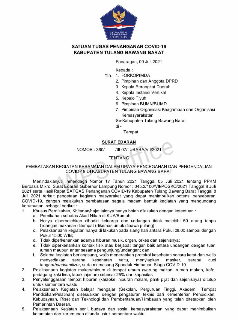 Menindaklanjuti Inmendagri tentang PPKM Berbasis Mikro, Surat Edaran Gubernur Lampung serta hasil rapat Satgas Penanganan Covid-19 tanggal 8 Juli 2021, maka Kabupaten Tulang Bawang Barat mulai melakukan pembatasan segala bentuk kegiatan masyarakat yang dapat menimbulkan potensi penyebaran Covid-19.