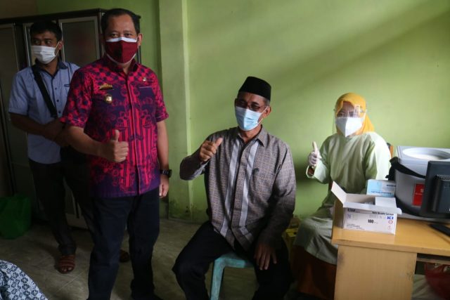 Tanggamus, Cyberkatulistiwa.com — Wakil Bupati Hi. AM. Syafi’i, didampingi Kepala Dinas Kesehatan Taufik Hidayat dan Camat Gisting Purwanti, meninjau pelaksanaan vaksinasi bagi Guru/Pendidik Kabupaten Tanggamus, di Puskesmas Gisting, Kamis,15Juli 2021.