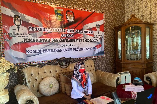 Tanggamus, Cyberkatulistiwa.com — Bupati Tanggamus Hj. Dewi Handajani, melakukan Penandatanganan Nota Kesepahaman (MoU) antara Pemerintah Kabupaten Tanggamus Dengan Komisi Pemilihan Umum (KPU) Provinsi Lampung, secara virtual meeting dari ruang kerja masing-masing, Rabu, 25 Agustus 2021.