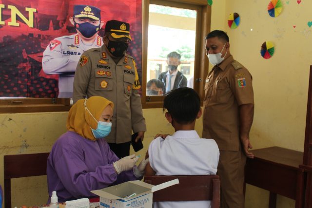 TuBaBa, Cyberkatulistiwa.com – Kapolres Tulang Bawang Barat (TuBaBa), AKBP Sunhot P Silalahi, S.IK., M.M. meninjau kegiatan vaksinasi Merdeka yang dilaksanakan dibeberapa sekolah menengah atas (SMA) dan seluruh gerai vaksin di wilayah hukum Polres TuBaBa.